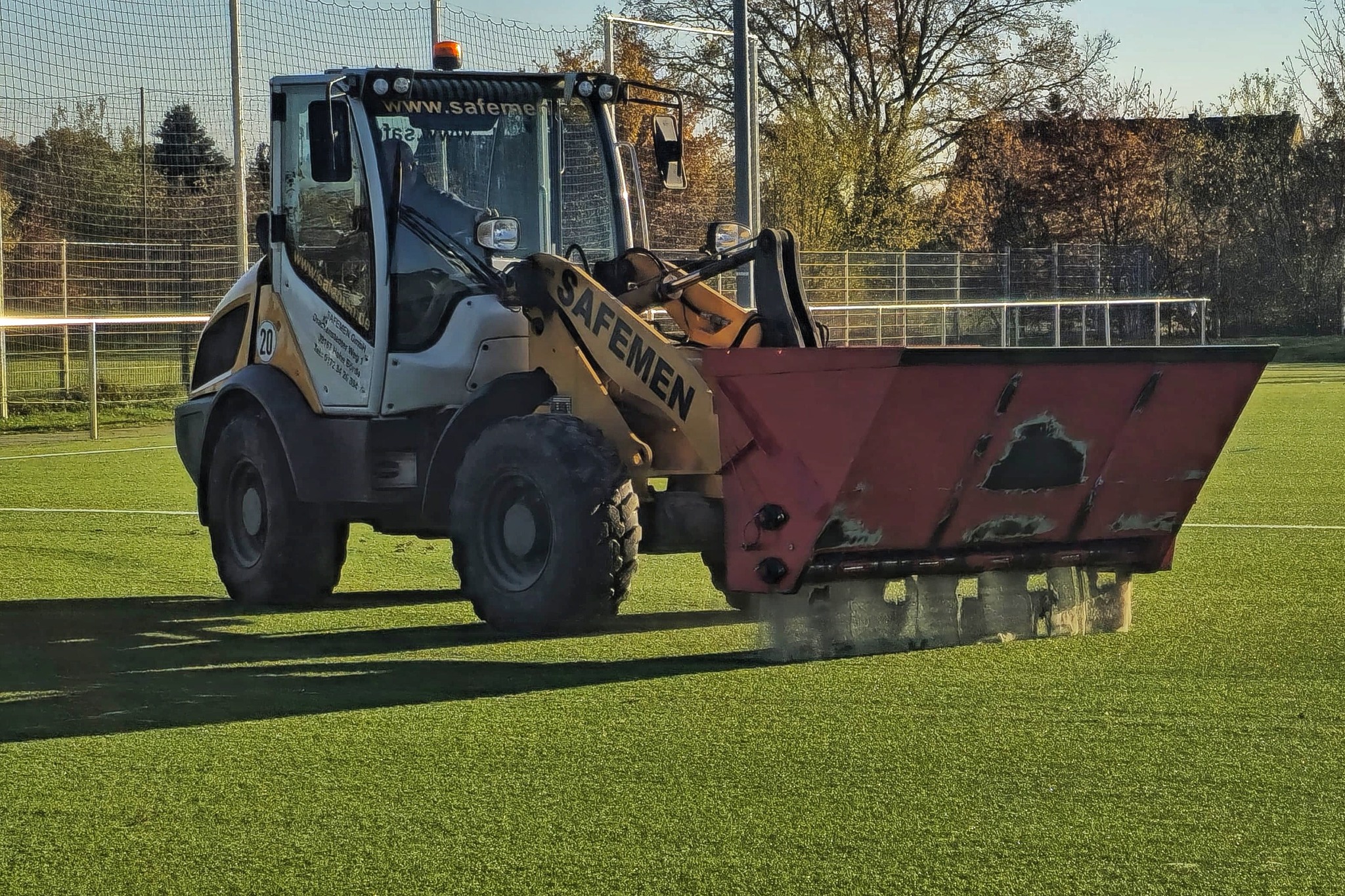 Damit unser Kunstrasenplatz auch weiterhin in bestem Zustand bleibt und uns noch viele großartige Fußballmomente ermöglicht, stand heute eine wichtige Pflegemaßnahme an: Die Besandung! Diese