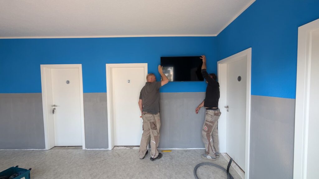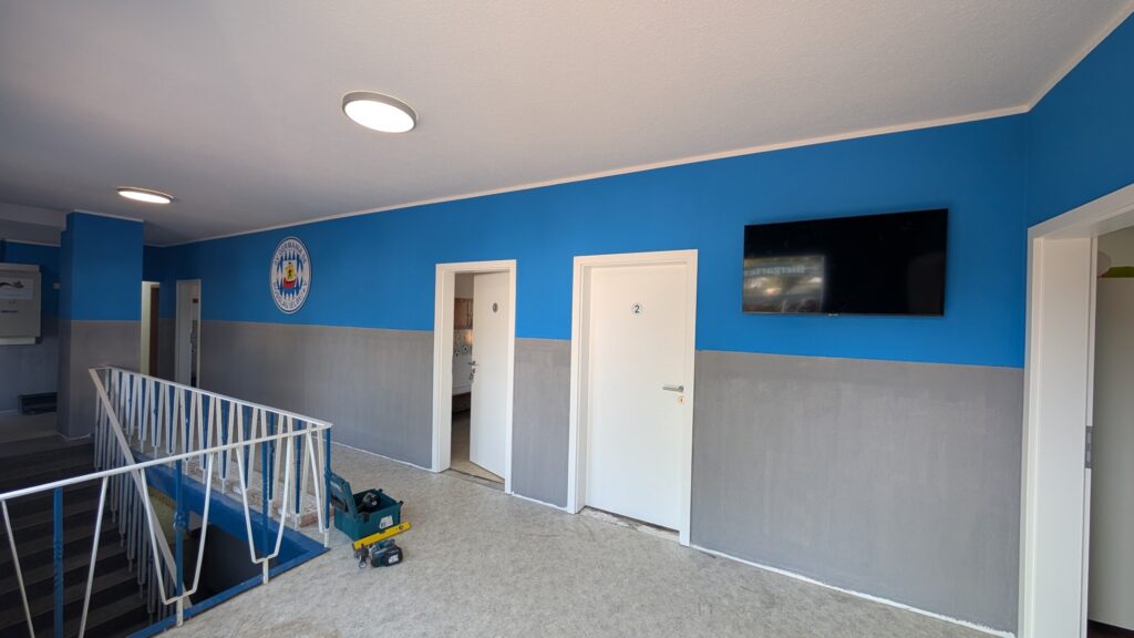 Am Wochenende waren wir auch noch einmal fleißig: Die Elektroarbeiten sind erledigt und ein 1 m großes Vereinslogo schmückt die frisch gestrichene Wand. Unser persönliches Highlight ist der neue Infopoint direkt im Eingangsbereich, der euch zukünftig über Spielankündigungen, Kabinenbelegung und vieles mehr informiert!