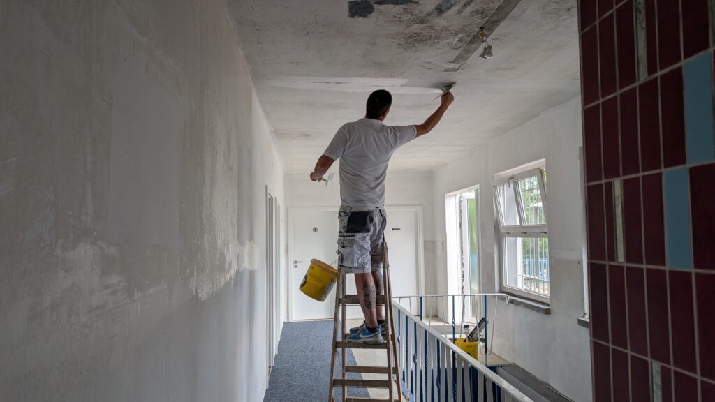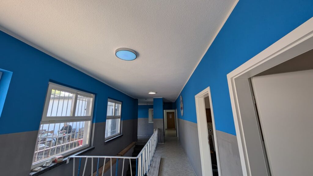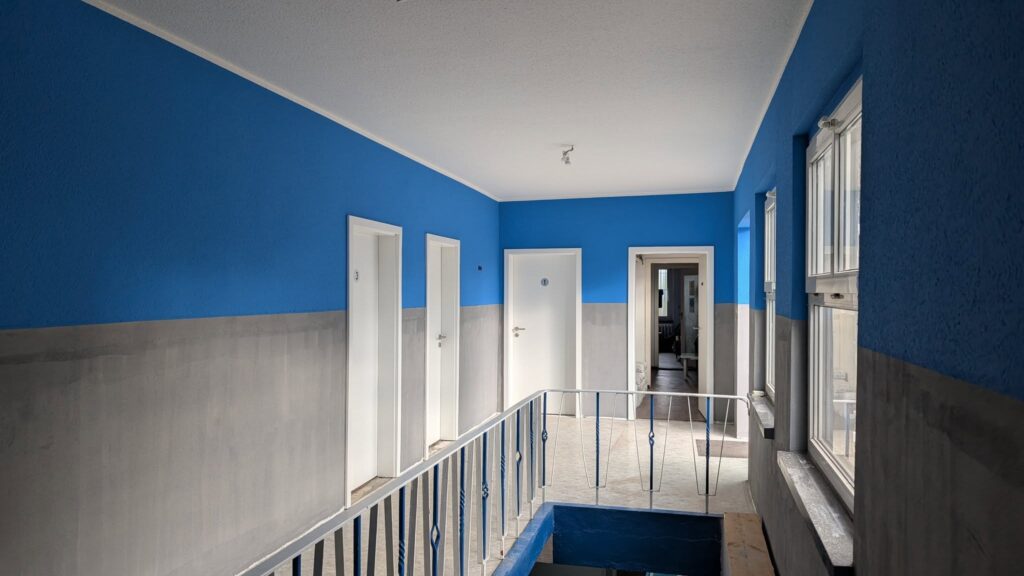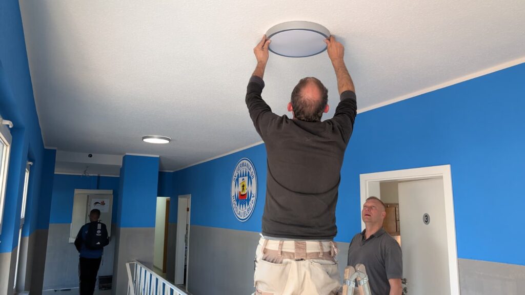 Die Maler haben ganze Arbeit geleistet: Unser Vereinsheim erstrahlt fast komplett in neuem Glanz! Die Wände haben ihren finalen Anstrich in Vereinsblau erhalten. Nur noch der Buntsteinputz fehlt, dann ist auch die Wandgestaltung abgeschlossen.