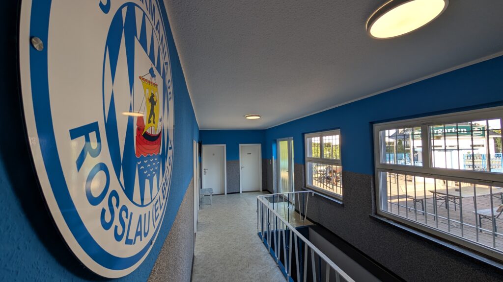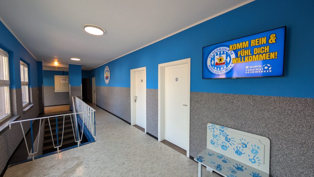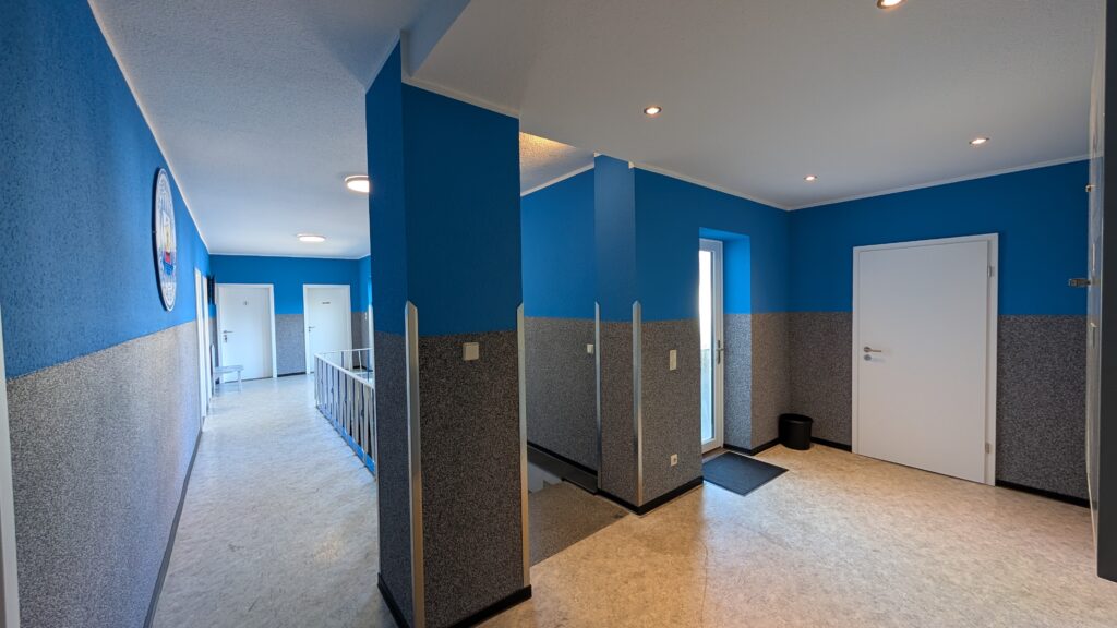 Ganz unter dem Motto „Komm rein und fühl dich willkommen“ erstrahlt der Flur nun in unseren Vereinsfarben inklusive großem Vereinslogo. Über den neuen Flatscreen werdet ihr in Zukunft über alle wichtigen News, Kabinenbelegungen und Veranstaltungen informiert. Die neuen LED-Lampen bringen euch hell und sicher durch den dunklen Winter, und die neuen Türen sorgen nicht nur für eine moderne Optik, sondern auch für mehr Ruhe und Privatsphäre!